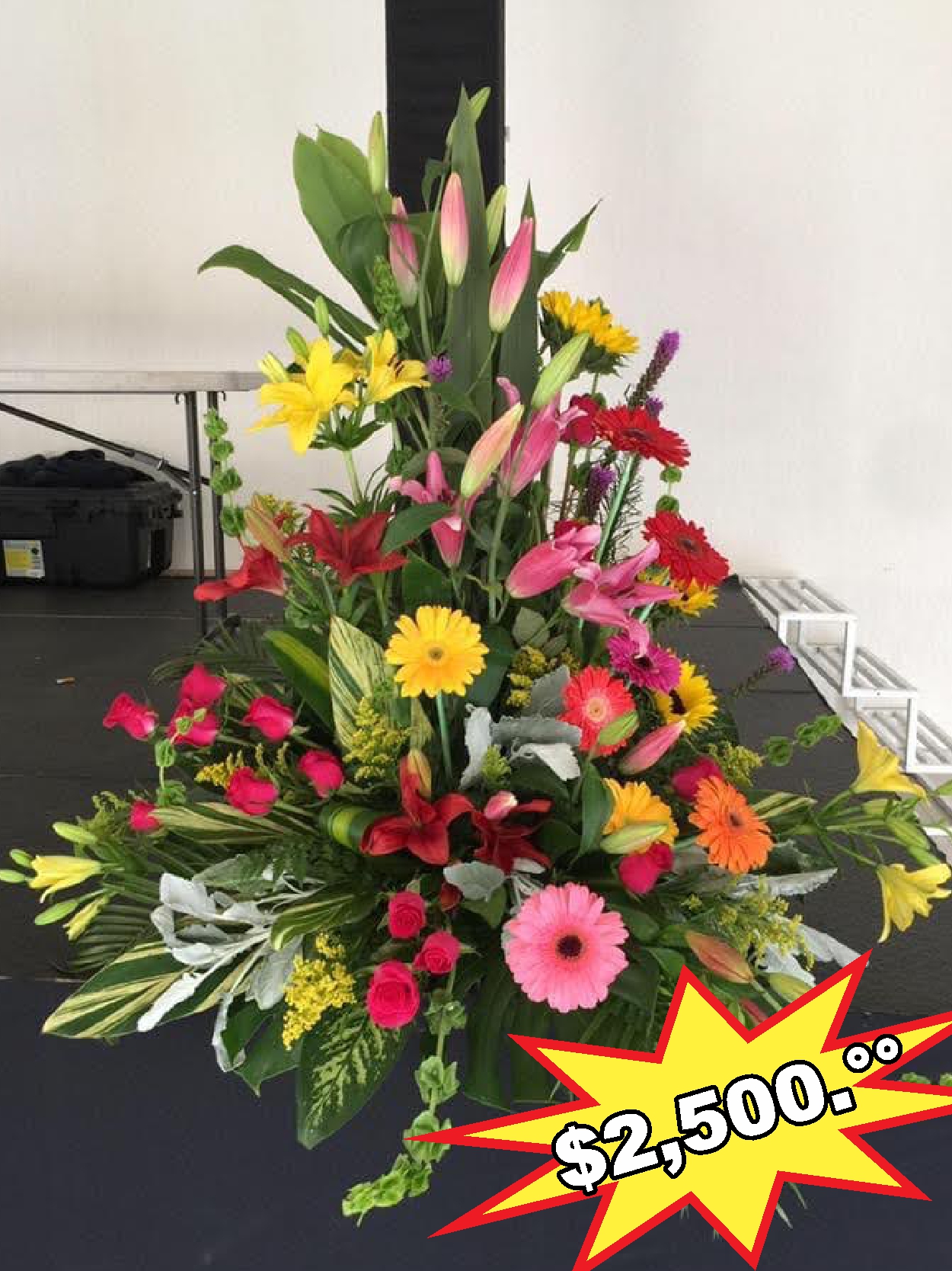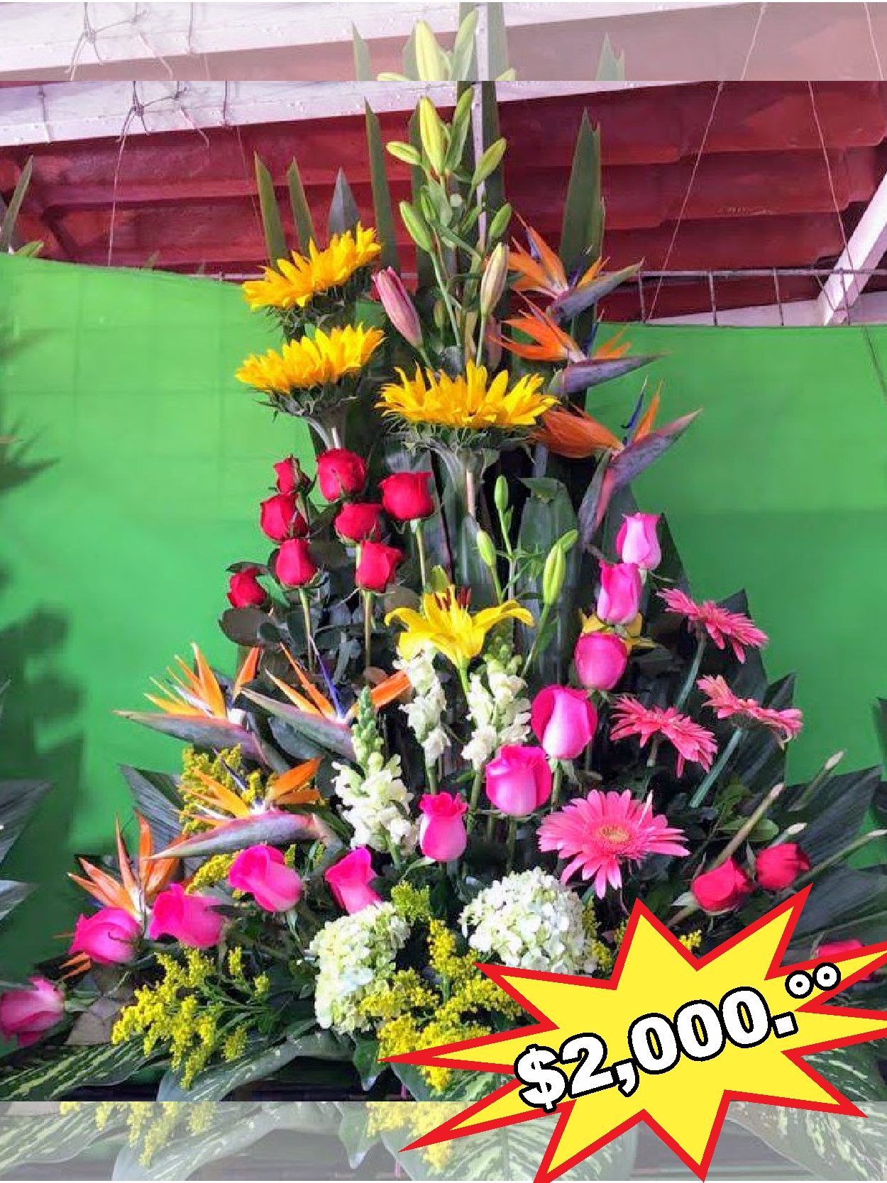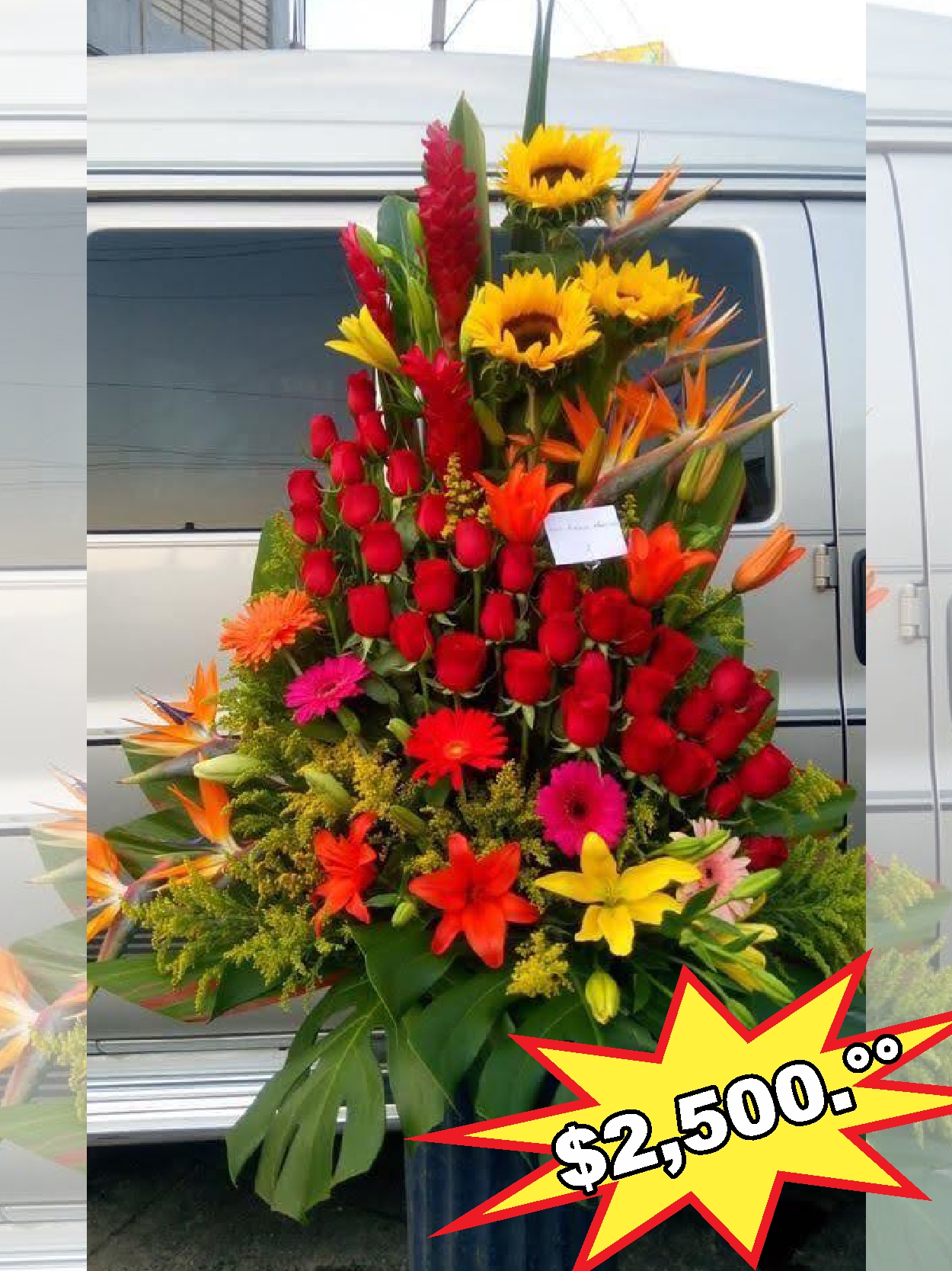 ARREGLO ESCALONADO, 30 ROSAS ROJAS, GIRASOLES, AVES DE PARAÍSO, GERBERAS, SOLIDAGO, GYPSOPHILIA, HORTENSIAS, MAICERAS