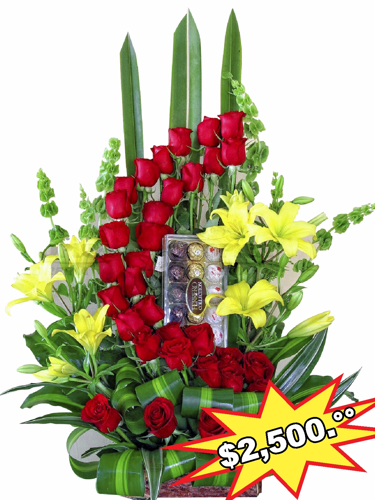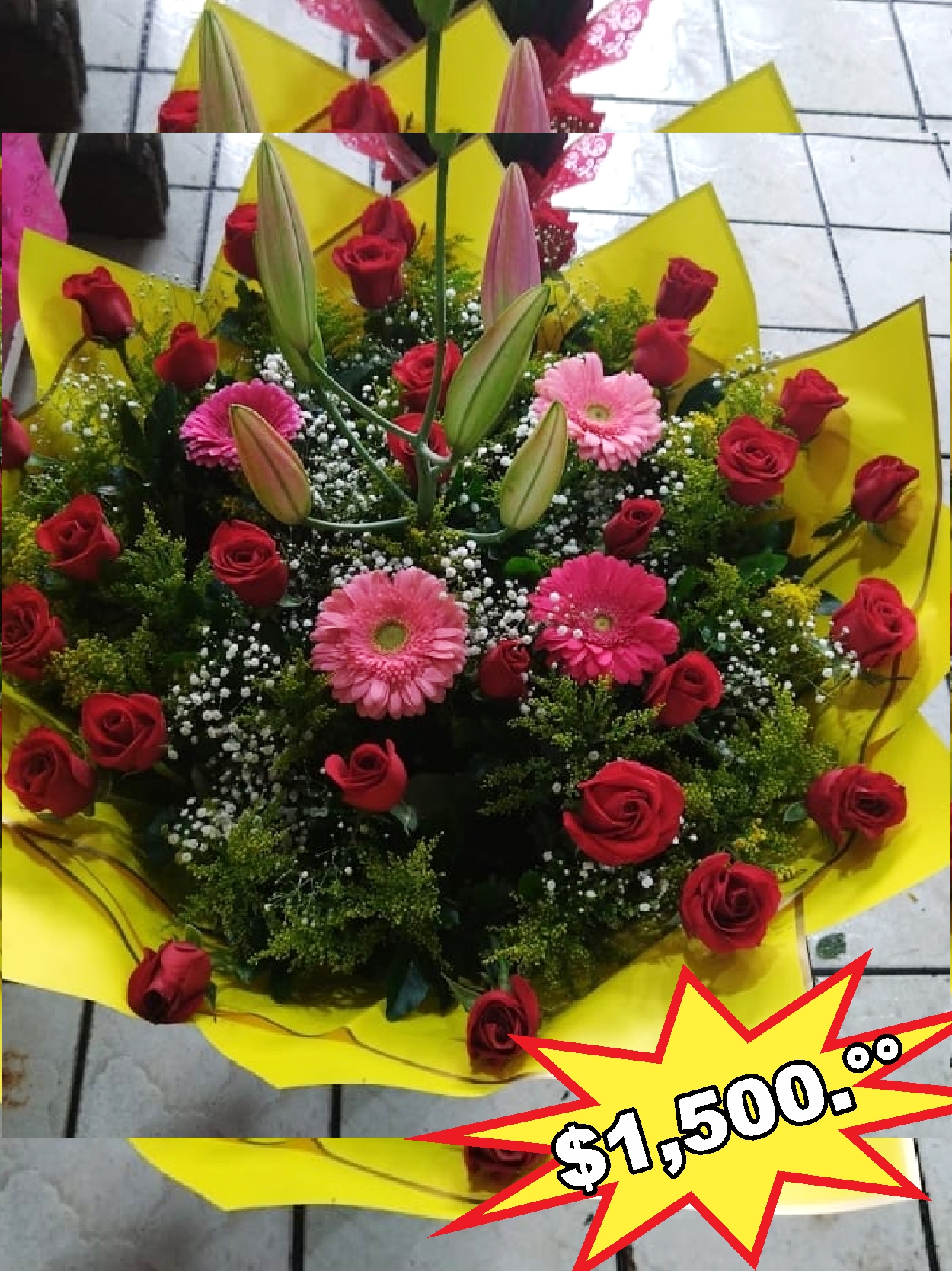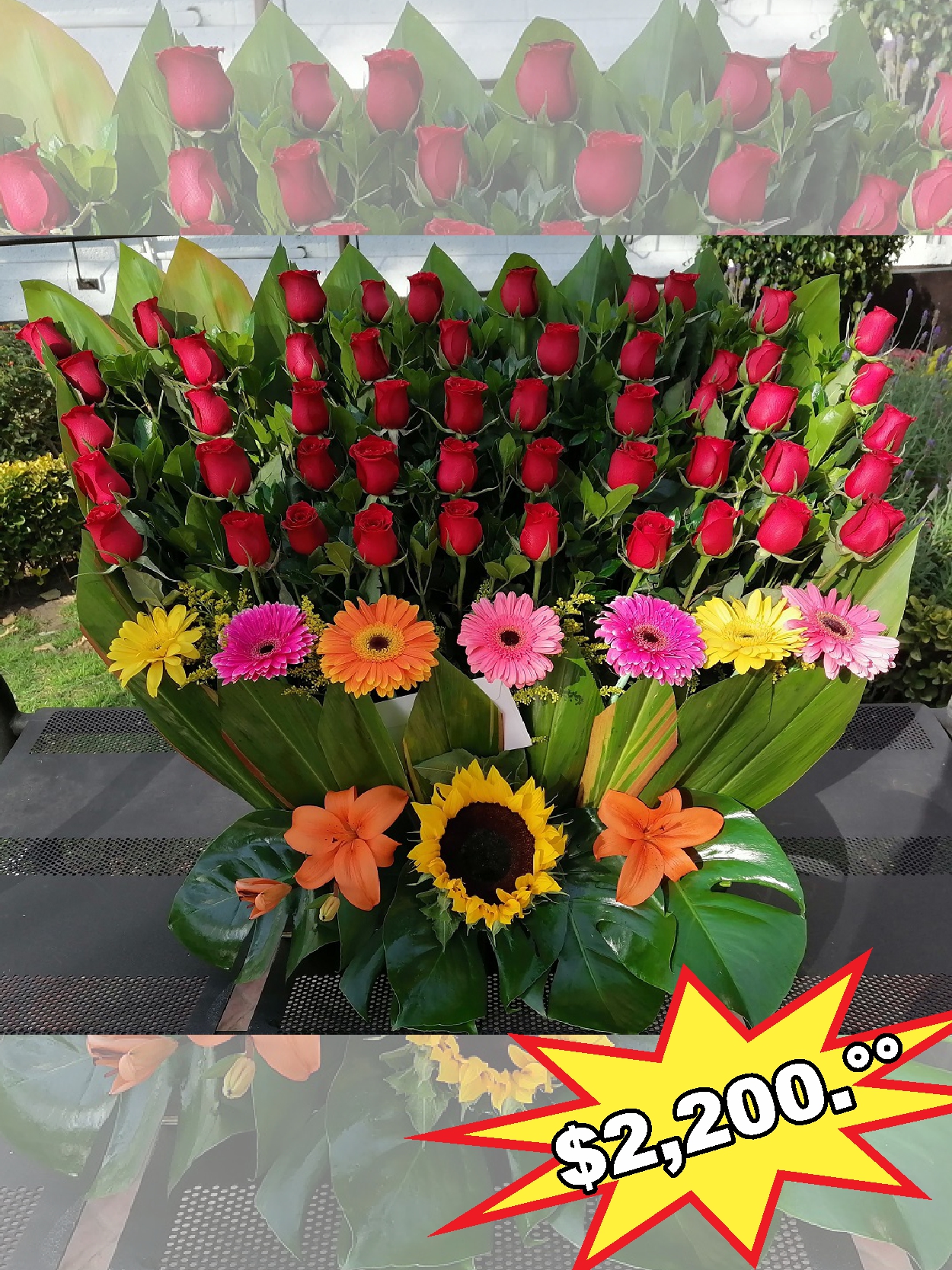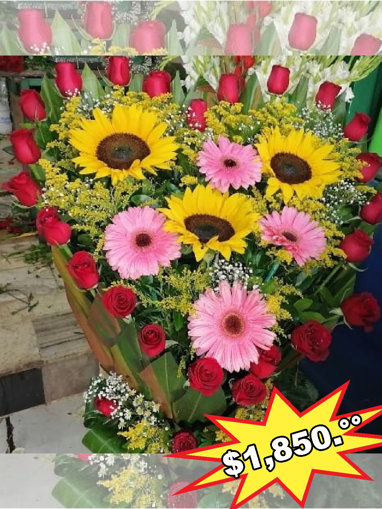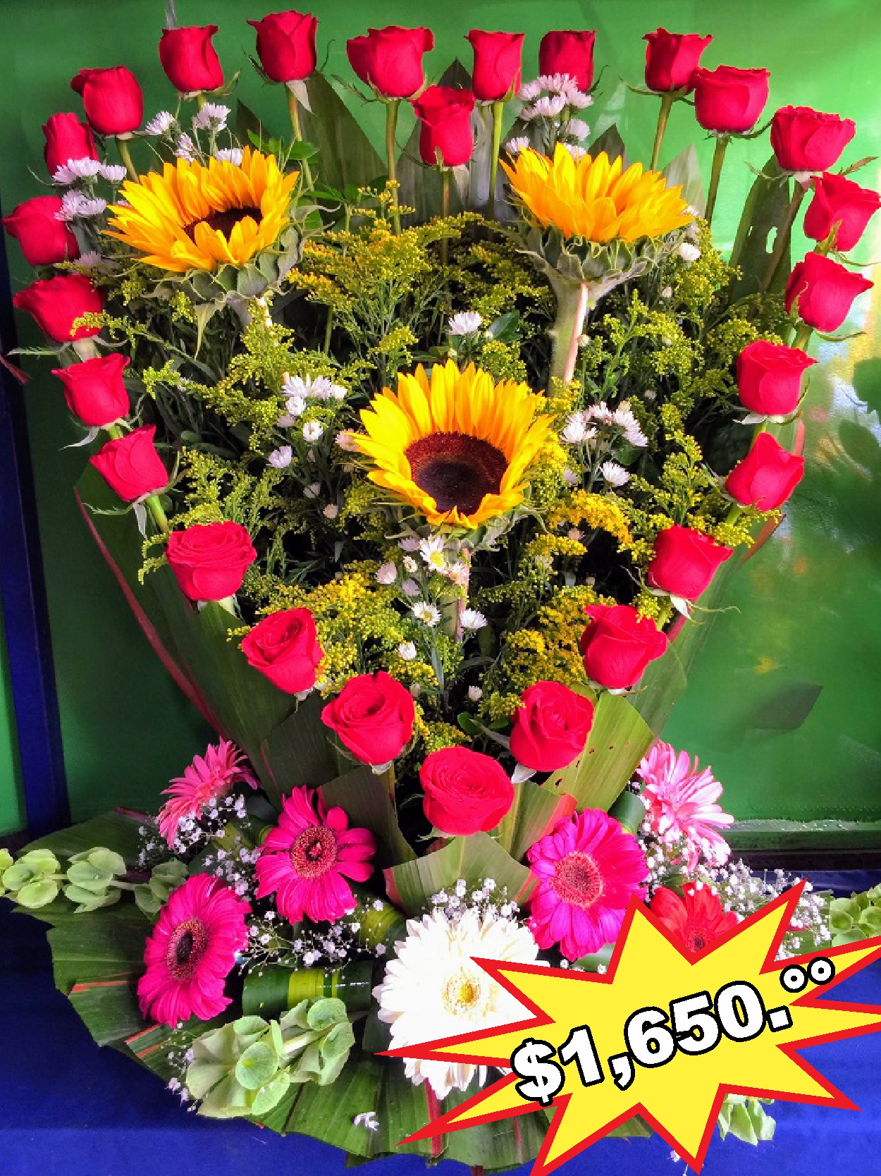 ARREGLO DE 14 ROSAS ROJAS, GERBERAS, GIRASOLES, TALLOS DE LILI