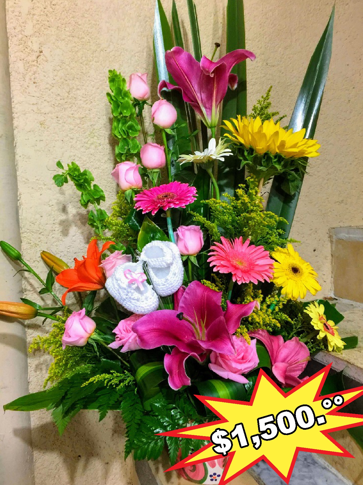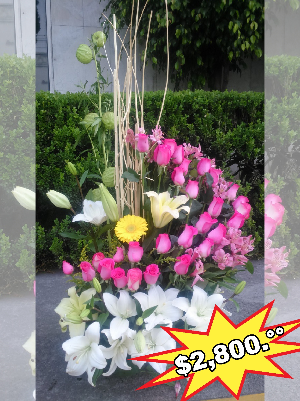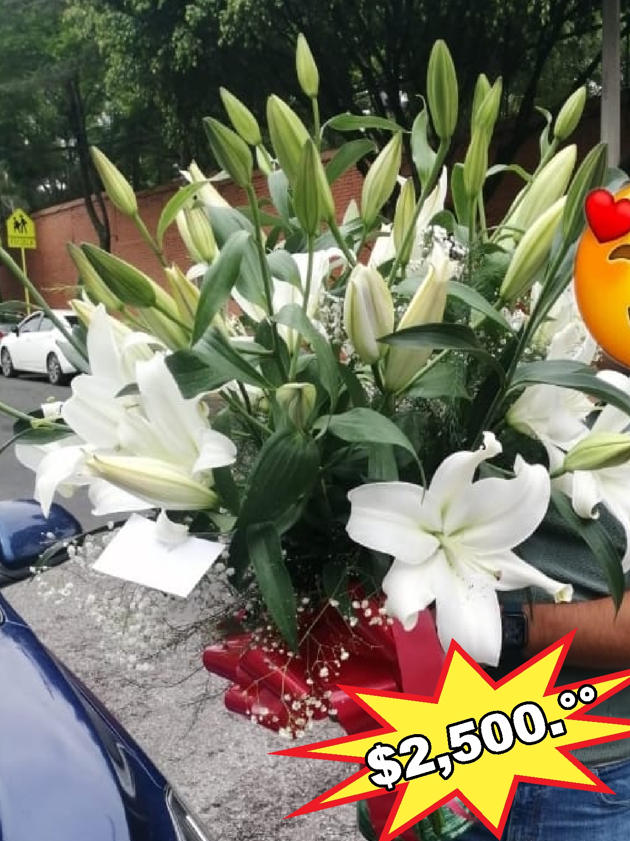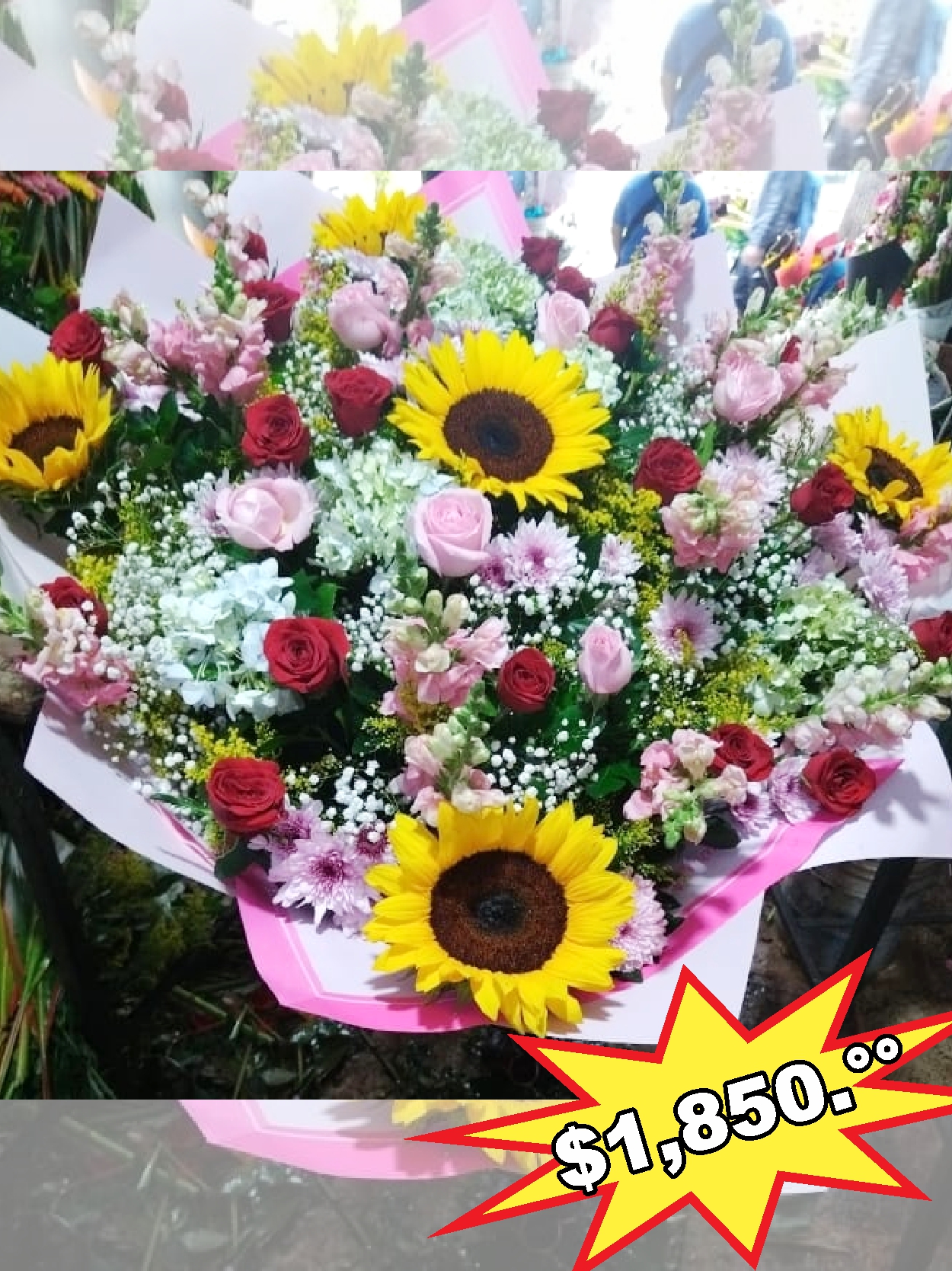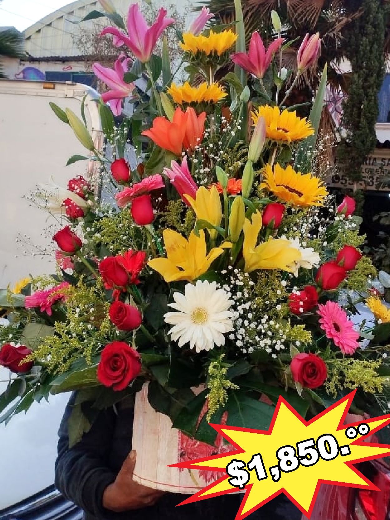 ARREGLO DE 14 ROSAS ROJAS, GERBERAS, GIRASOLES, TALLOS DE LILI