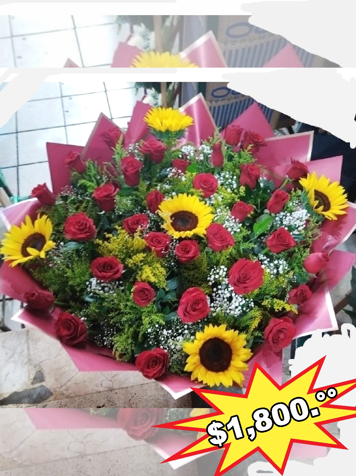 ARREGLO FLORAL DE 36 ROSAS ROJAS, 3 GIRASOLES