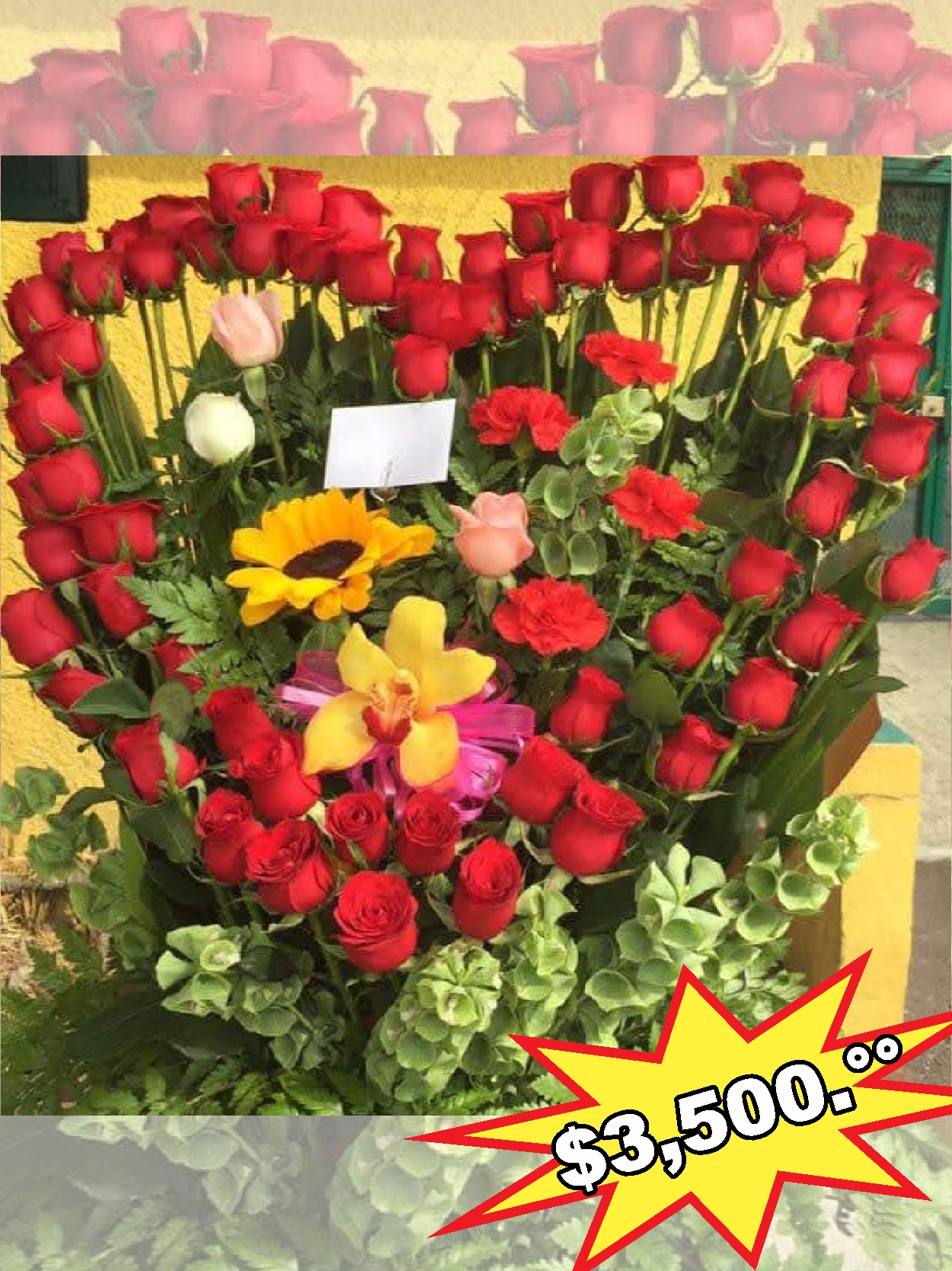 ARREGLO DE 70 ROSAS, ORQUÍDEA, GIRASOL, MOLUCELLA, LEATHER, GRACENIA