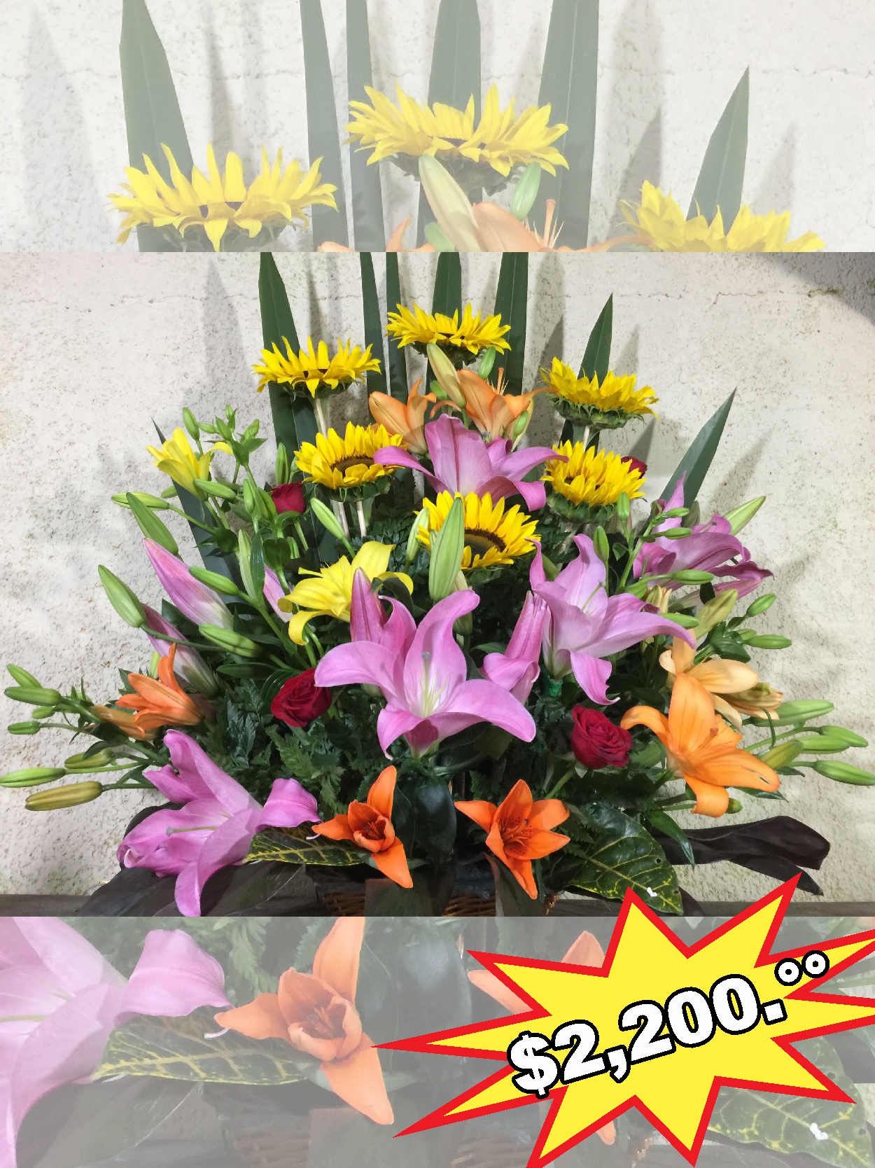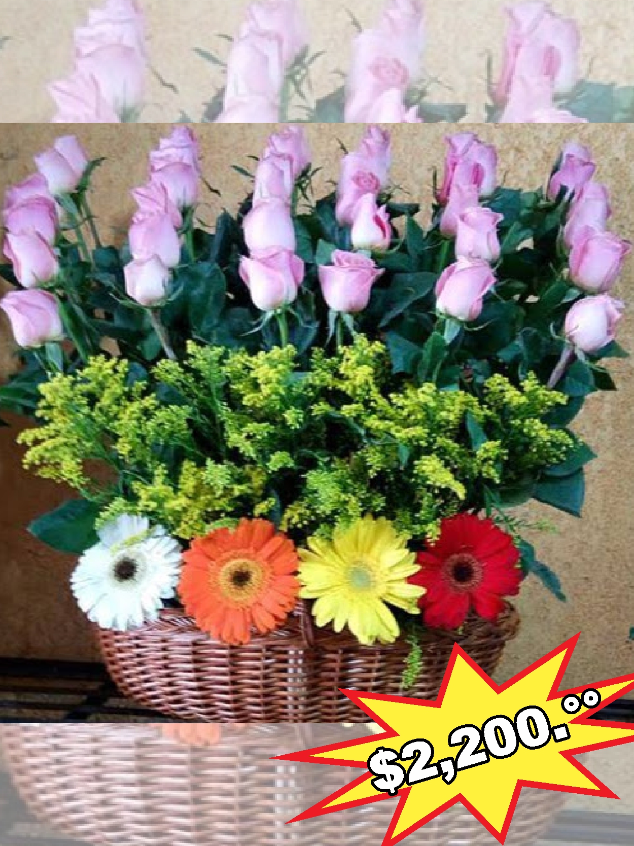 ARREGLO DE 25 ROSAS, GERBERAS, TALLOS DE LILI, GIRASOLES EN CANASTA DE MIMBRE