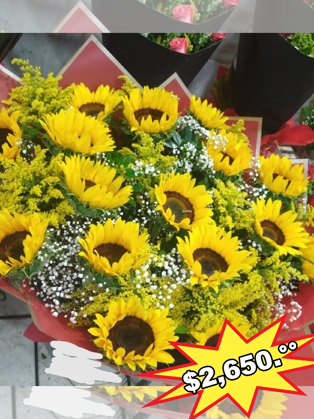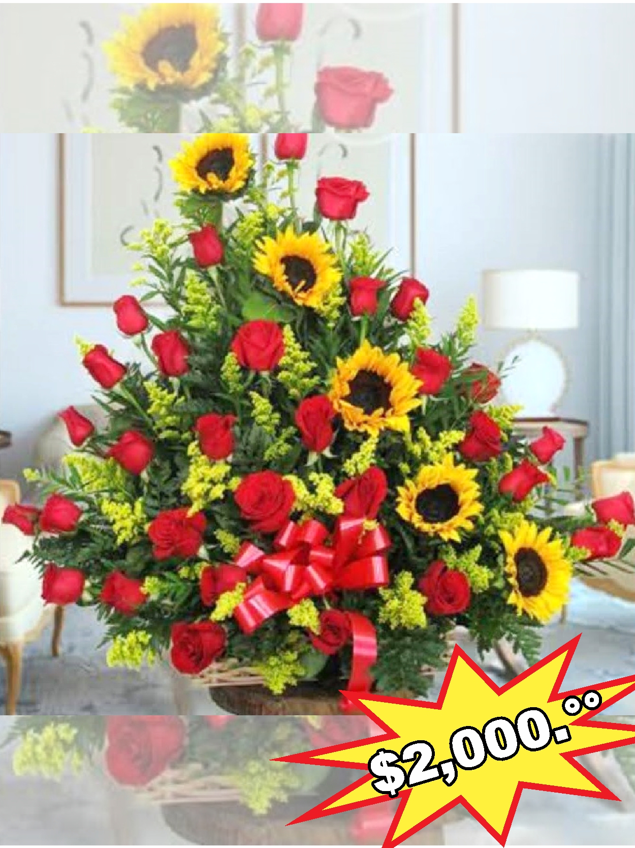 ARREGLO FLORAL DE UNA VISTA DE 8 ROSAS ROJAS, 4 GIRASOLES, MOLUCELLA, GYPSOPHILIA, LEATHER, GRACENIAS, HOJAS DE MARIPOSA, FORNIOS