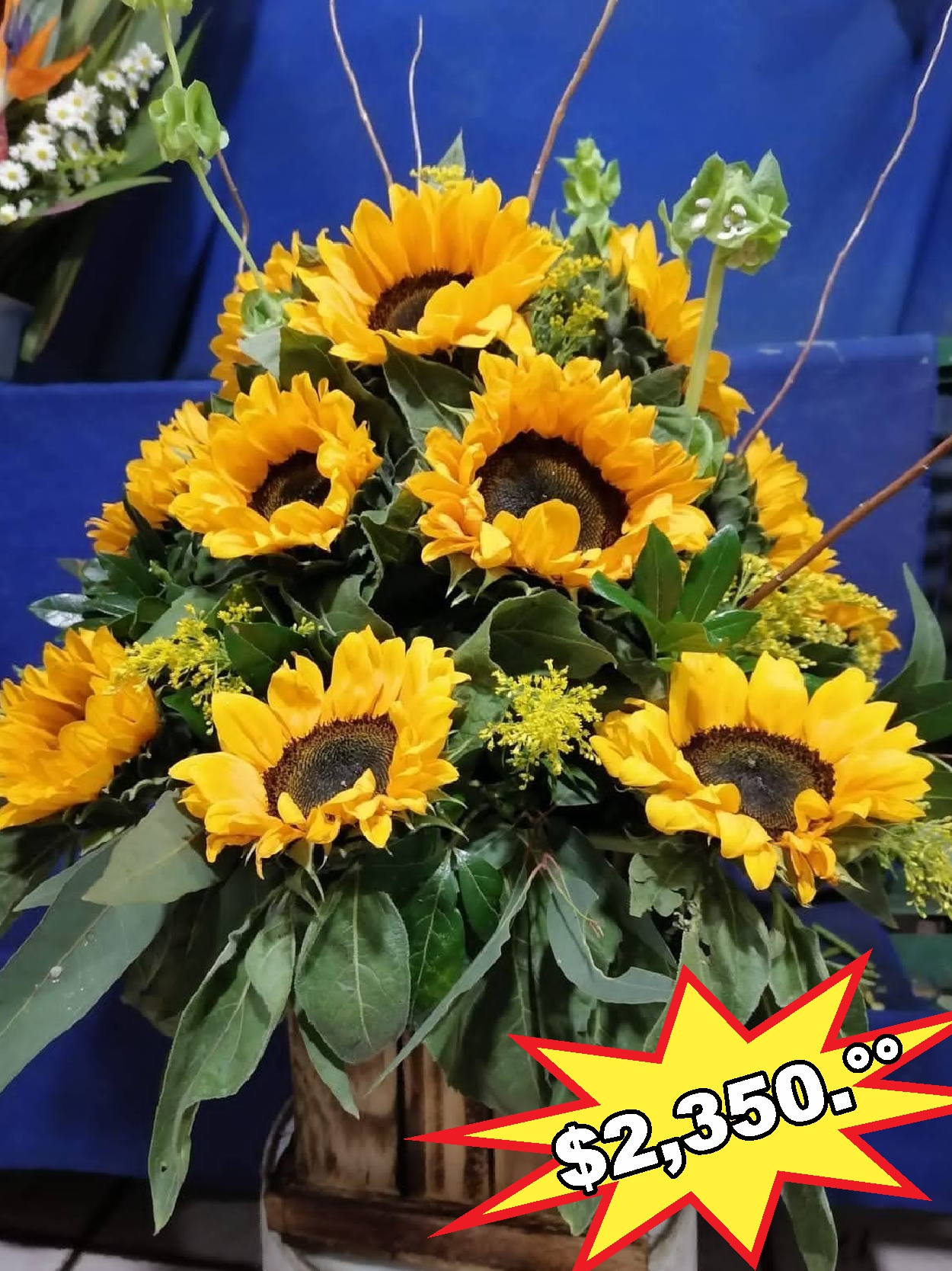 ARREGLO CUADRADO DE 9 GIRASOLES, CON GERBERAS, MAICERAS, LILI, SOLIDAGO, CLAVO