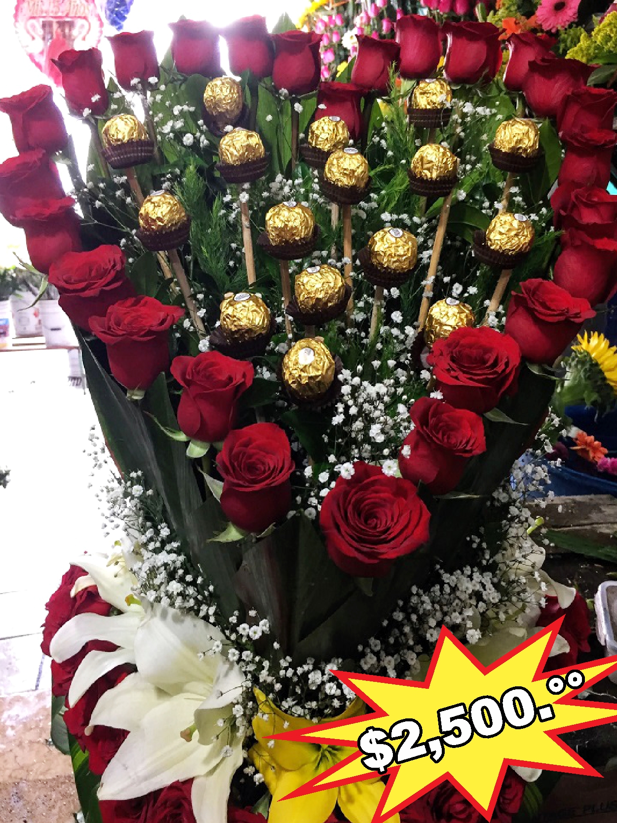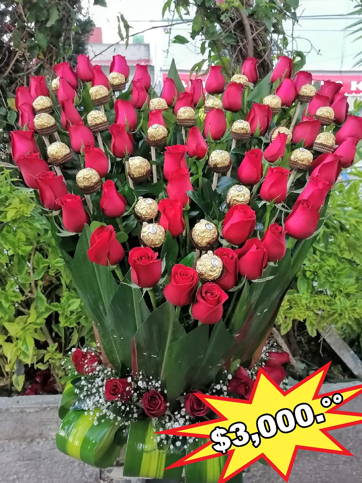 ARREGLO DE 60 ROSAS, 27 CHOCOLATES FERRERO ROCHER