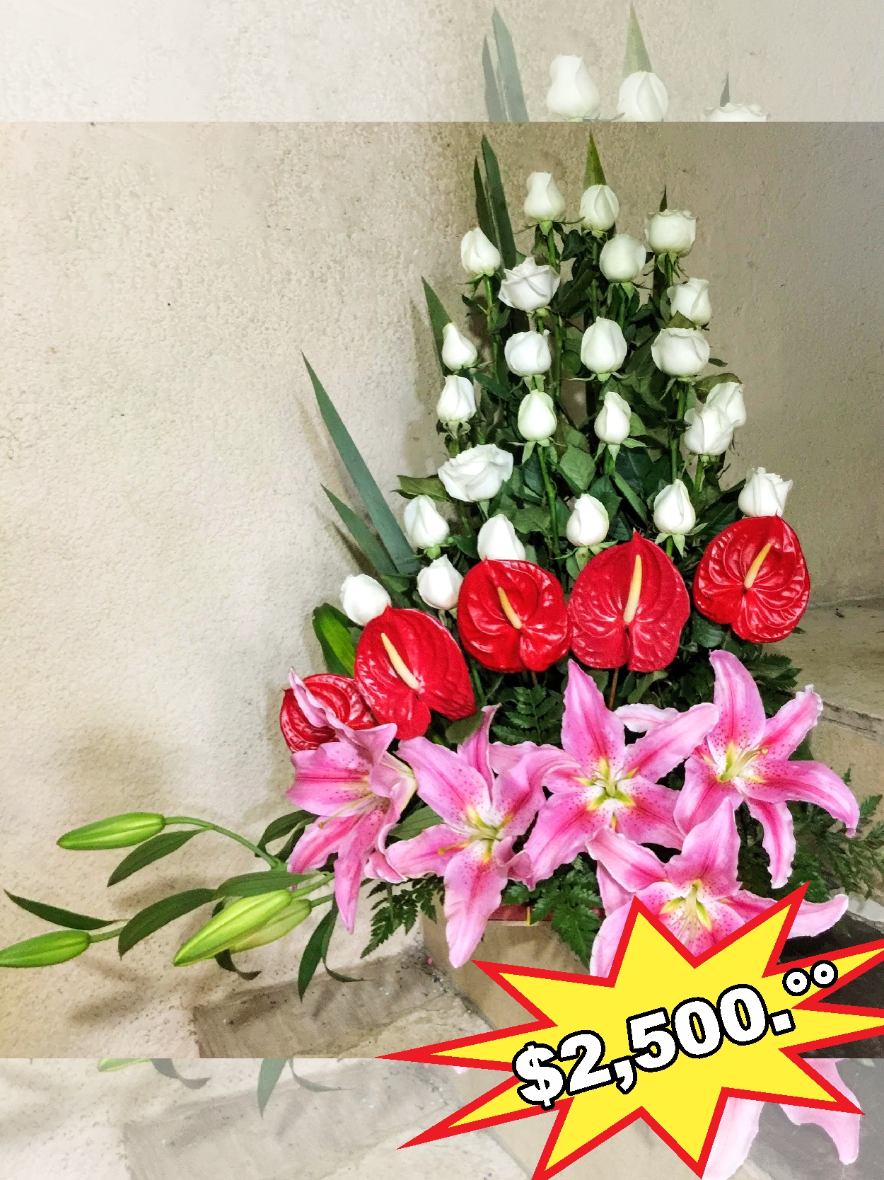 ARREGLO DE 5 ANTURIOS ROJOS, 24 ROSAS BLANCAS