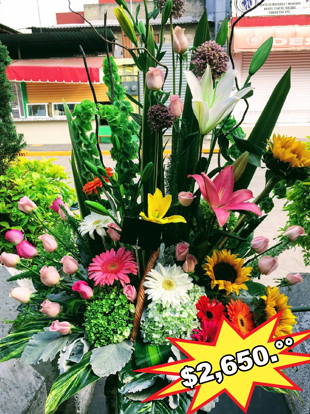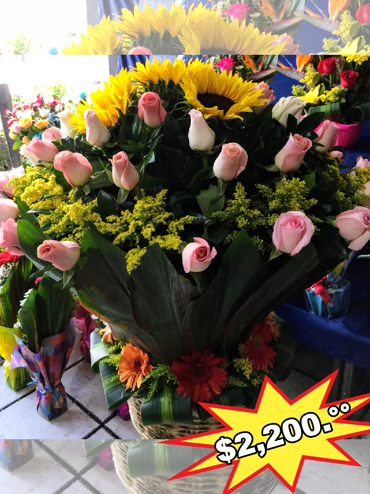 ARREGLO DE 25 ROSAS, GERBERAS, TALLOS DE LILI, GIRASOLES, FLOR DE AJO, HORTENSIA, MOLUCELLA, DUSTY MILLER, HOJAS DE MARIPOSA, MAICERA, COLA DE ZORRO, CURLY, PLUMOSO, FORNIO EN CANASTA DE MIMBRE