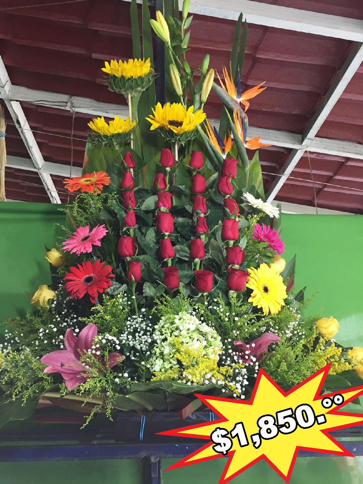 ARREGLO ALTO DE 16 ROSAS ROJAS, 2 GIRASOLES, TALLOS DE LILI, GERBERAS, MAICERAS, FORNIO, AMOENA, NATURALEZA MUERTA, SOBRE BASE DE MADERA