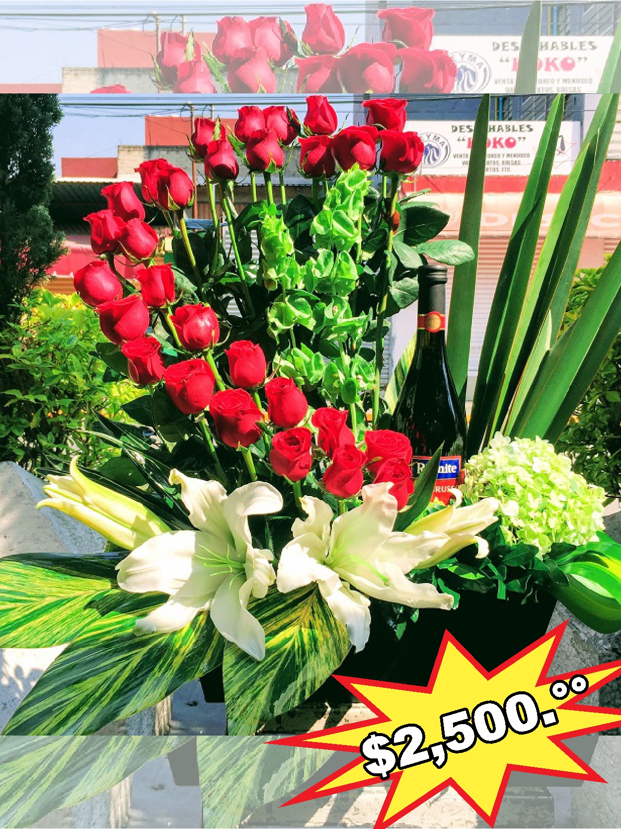 ARREGLO DE 10 ROSAS ROJAS, 2 TALLOS DE LILI, 3 GERBERAS, 2 AVE DE PARAÍSO, CURLY, GYPSOPHILIA, LEATHER, GRACENIA, MAICERA, FORNIO