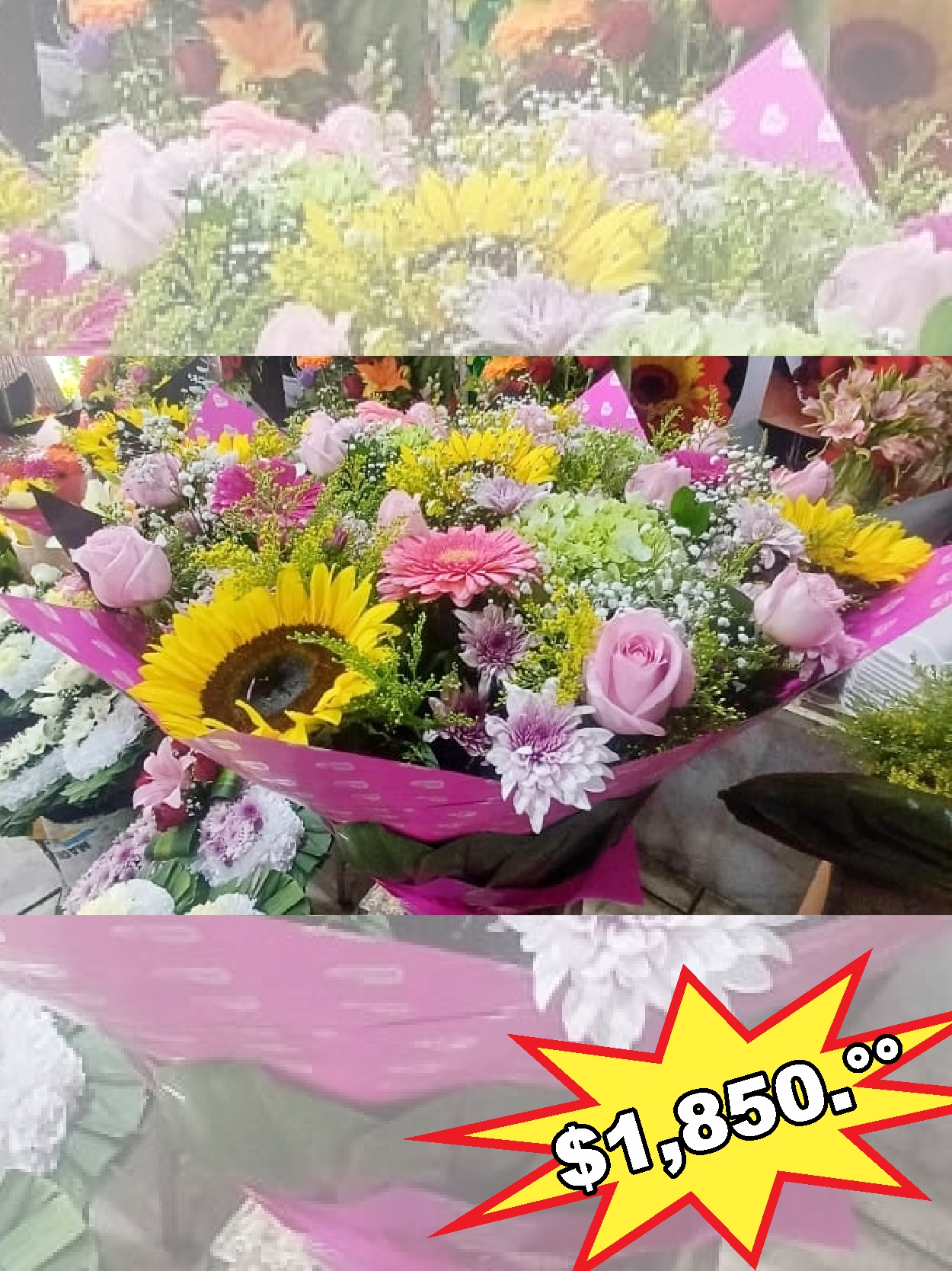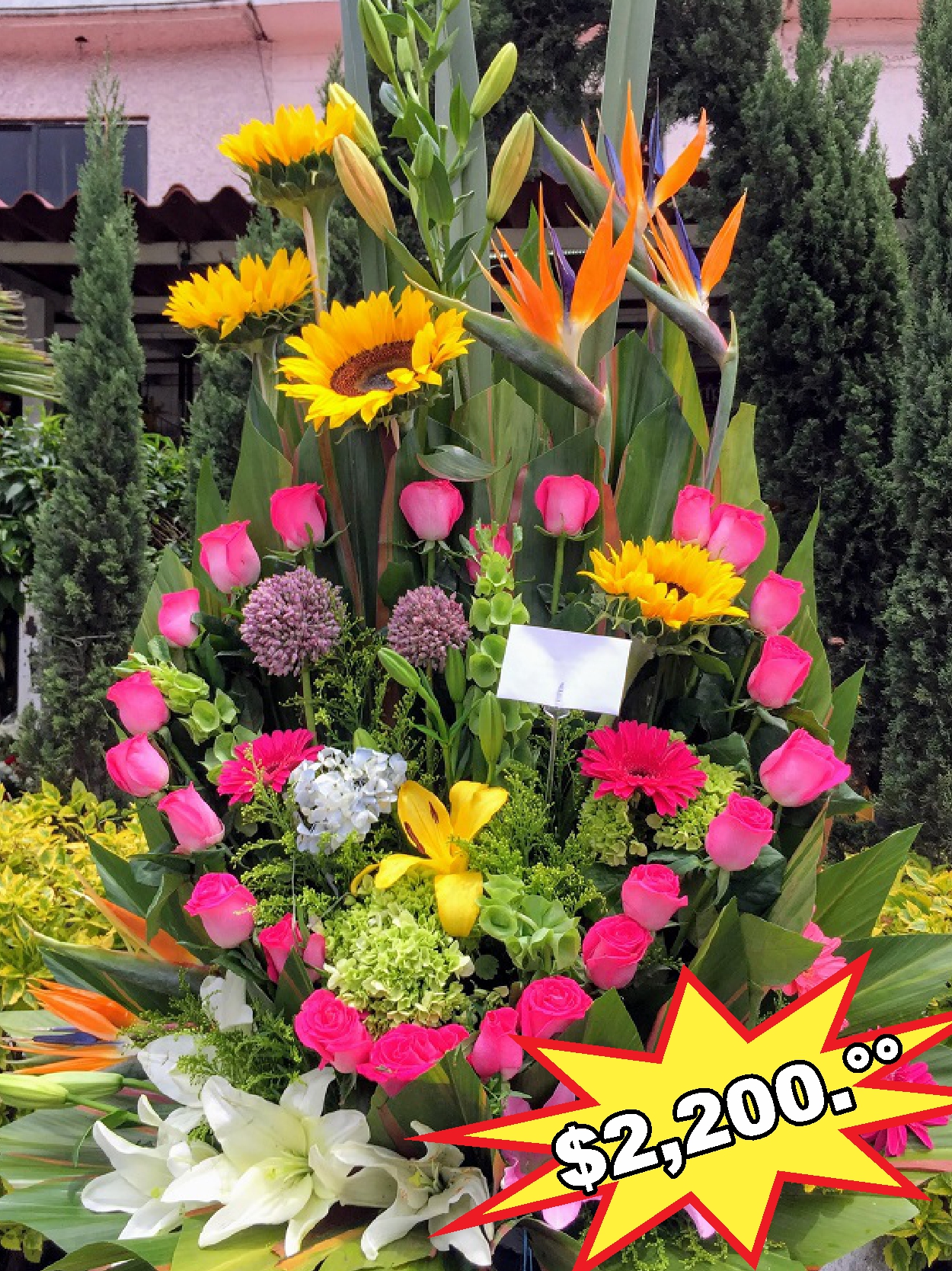 ARREGLO DE 23 ROSAS FUCSIA, 4 GIRASOLES, GERBERAS, AVES DE PARAÍSO, TALLOS DE LILI, HORTENSIAS, FLOR DE AJO, MOLUCELLA, GRACENIAS, SOLIDAGO