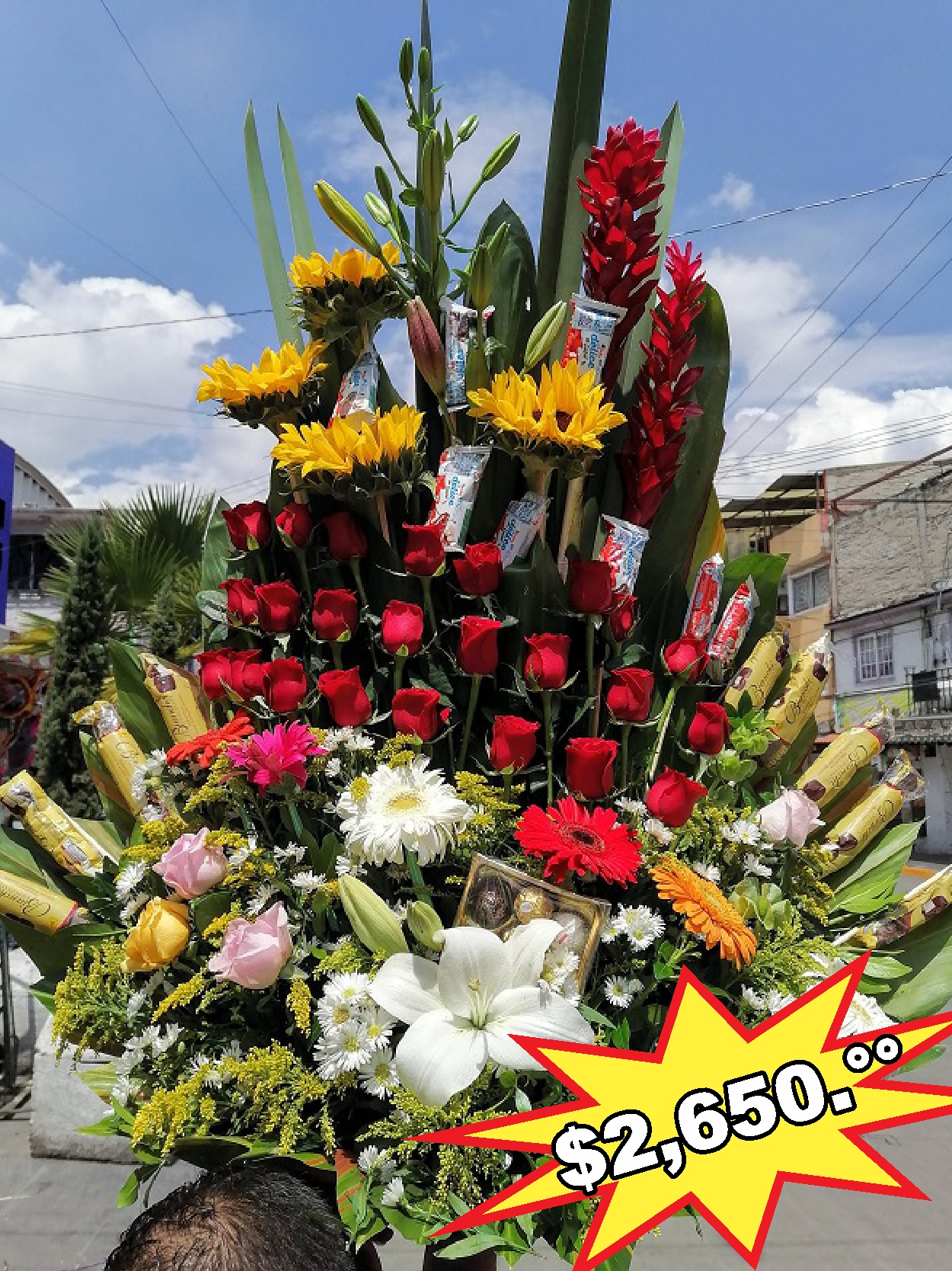 ARREGLO DE 27 ROSAS, GIRASOLES, HAWAIANA, TALLOS DE LILI, GERBERAS, FORNIOS, MONTECASINO, SOLIDAGO, GRACENIAS, 8 PASTELES KÍNDER DELICE, CHOCOLATE CON MALVAVISCO, 9 CHOCOLATES FERRERO ROCHER
