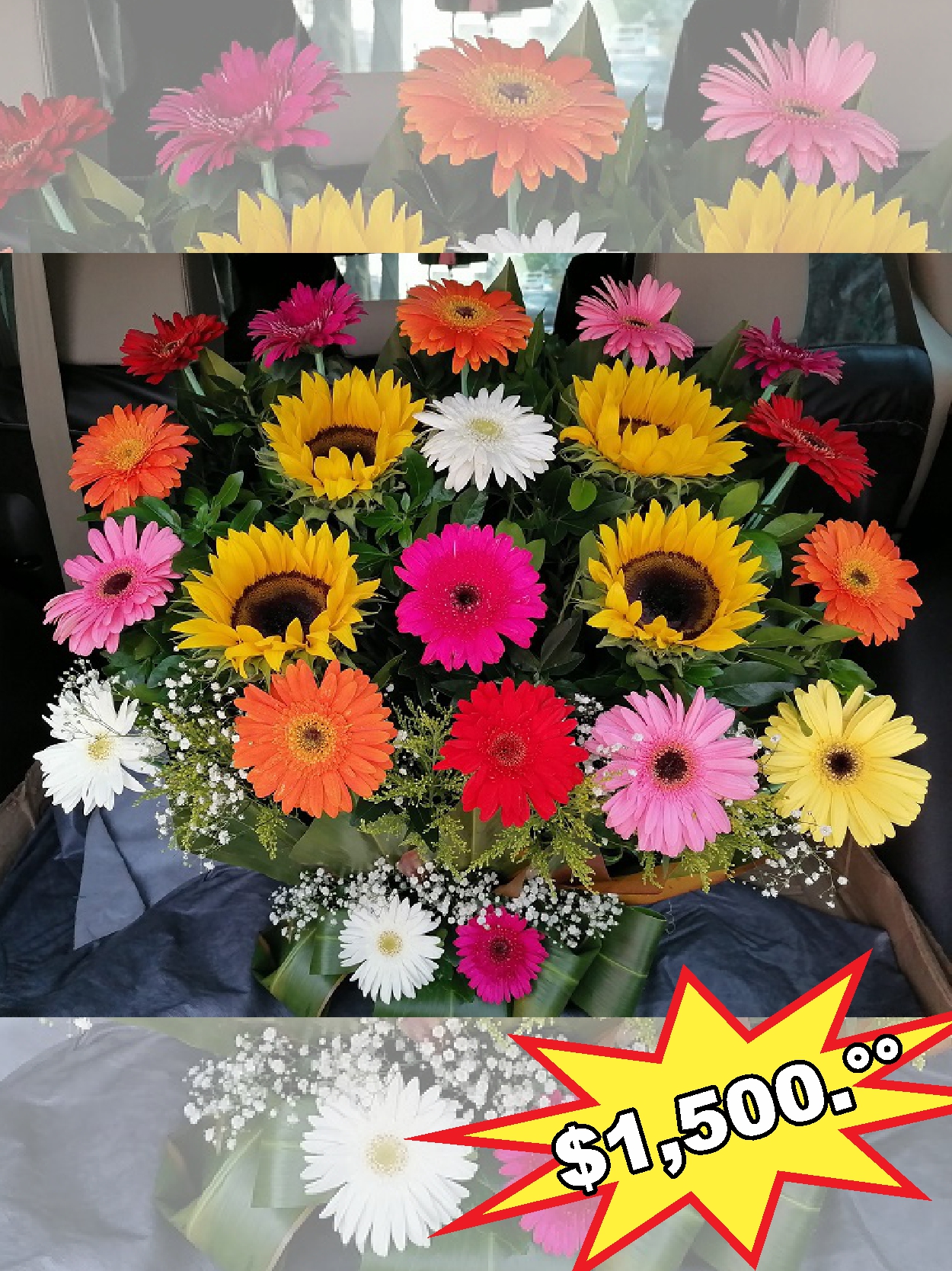 ARREGLO DE 23 ROSAS FUCSIA, 4 GIRASOLES, GERBERAS