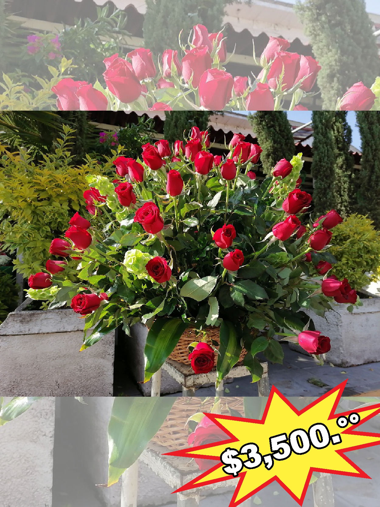 ARREGLO CUADRADO DE 36 ROSAS EN CANASTA DE MIMBRE